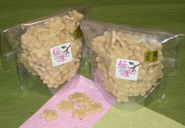 桜の花の形に焼き上げた可愛いあられに、桜葉の粉末を砂糖でからめ、香り高く仕上げました